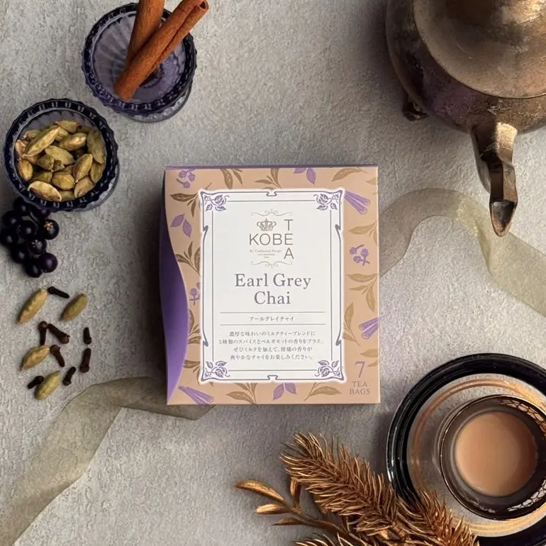 以神戶紅茶的人氣款「No.18 英式早餐茶」為基底,加入小荳蔻、肉桂、丁香、生薑與黑胡椒五種香料,再添上一抹佛手柑的清香──全新調製出層次豐富的「伯爵印度香料茶」。