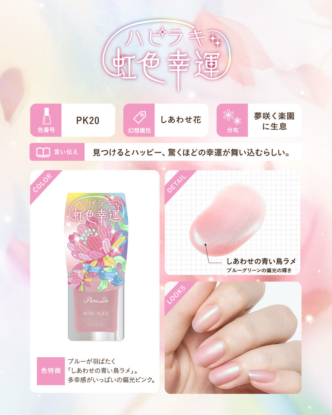 ◆顏色特徵:如青藍色展翅般飛舞的「幸運青鳥亮片」,閃耀著滿溢幸福感的偏光粉色。