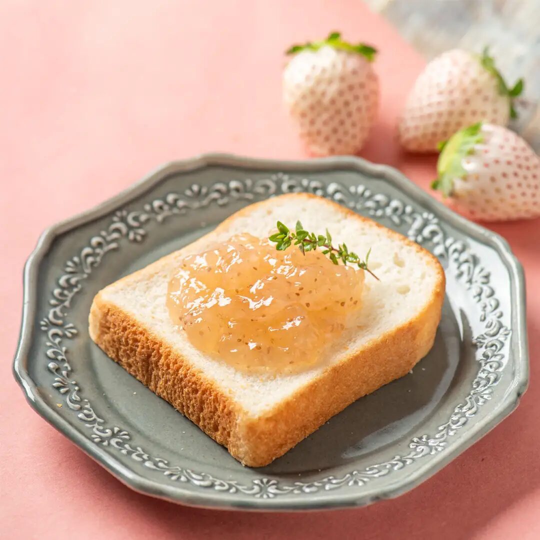 奢侈地使用珍稀的白草莓「珍珠白」製作。「珍珠白」本身帶有讓人聯想到桃子和花朵的柔和香氣,且甜味清爽。搭配吐司或優格,便能享受香氣四溢的奢華時光。