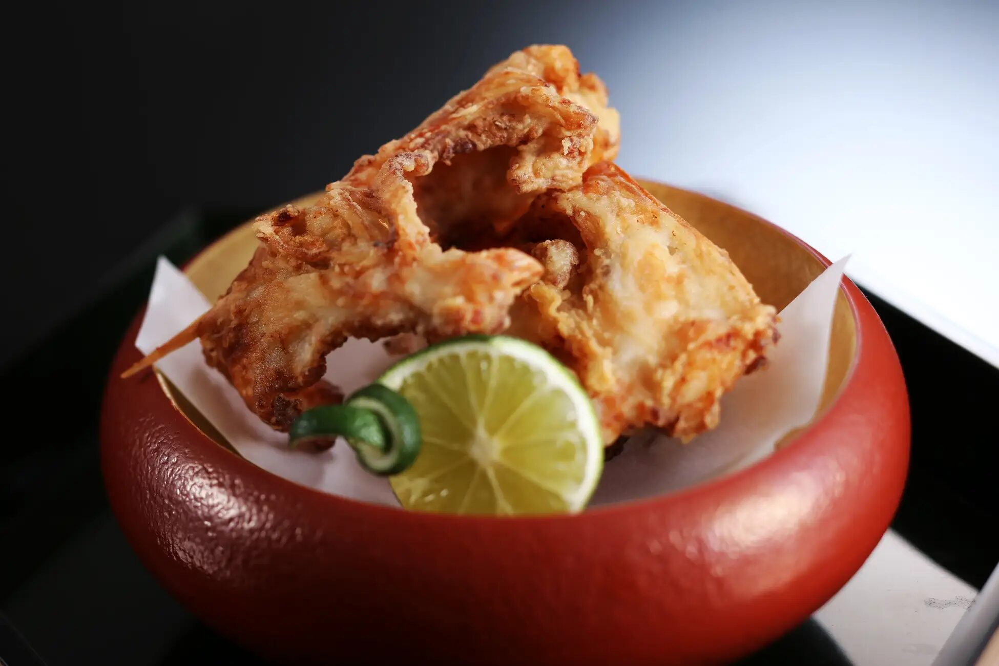 經過高溫油炸的但馬虎河豚外層酥脆、內裡紮實,越咀嚼越能感受到其深厚鮮味,是一道令人回味無窮的餐點。